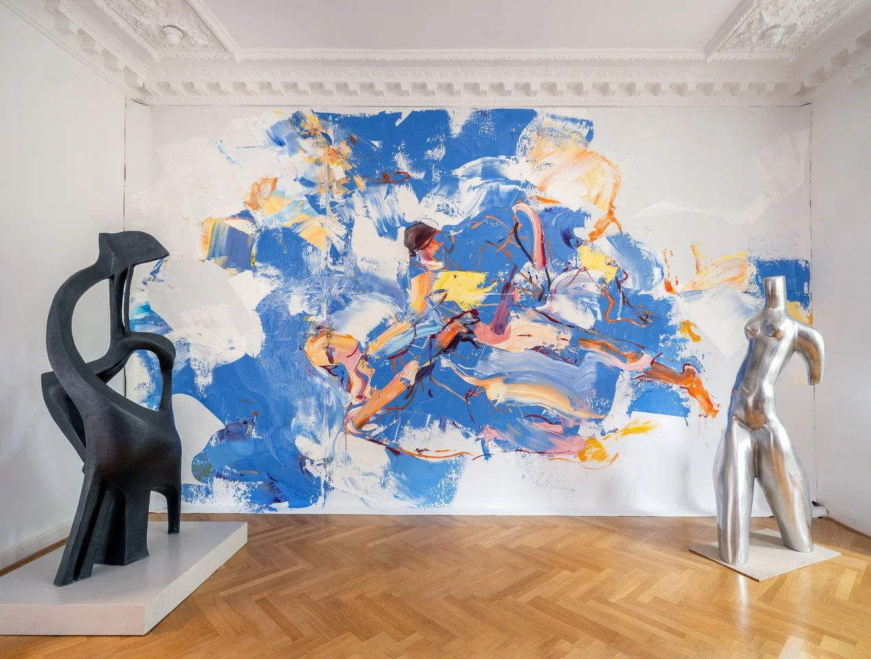 Davor stehen meine beiden großen Skulpturen „Chaos & Harmony“ (Bronze, 200 cm hoch) und „Großer Entschluss“ (Aluminium, 190 cm hoch)